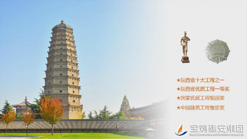 With gross building area of 1699m2, the world-famous Famen Temple reconstruction and Famen Temple Museum project has drawn attention from all around the world; the project, with its characteristics of ancient tang-simulation building style, vivid Ming Dynasty tower totally copying mode, beautiful and firm concrete dual-drum cast-in-situ structure and the like, has won may awards including one of Shaanxi top ten projects, first price of Shaanxi high quality project, national high quality project silver price and Chinese construction project Luban prize;