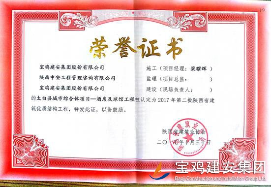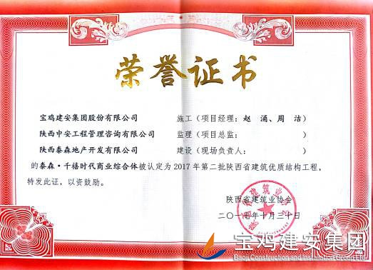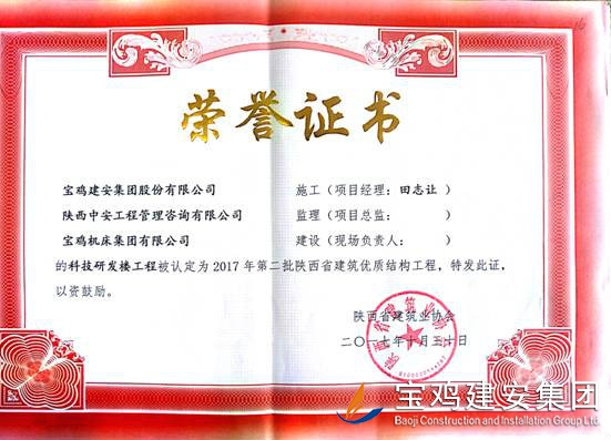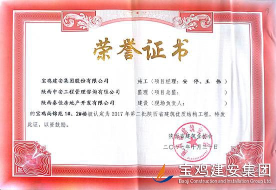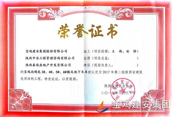 2018年1月26日從陜西省建筑業協會傳來喜訊,由寶雞建安集團股份有限公司負責施工的“科技研發樓工程”(五項目部)、“泰森?千禧時代商業綜合體”(六項目部)、“寶雞尚錦苑1#、2#樓”、“寶雞尚錦苑3#、4#、5#、6#樓及地下車庫”及“太白縣城市綜合體項目—酒店及球館工程”(路橋項目部)被陜西省建筑業協會評為2017年第二批陜西省優質結構工程獎。 通過本次獲獎,各項目部能夠依據項目創優要求和相關法律法規開展質量創優工作,對現場原材料、檢驗批、分部、分項工程及功能性設施進行質量管理,做好“三檢”工作,切實履行了質量管理職責。在施工過程中,公司加強對項目實體質量和資料的檢查監督,推行質量標準化,確保了每一項工程都能順利驗收通過。 希望各項目部在2018年應夠繼續加強現場質量意識,提升項目質量管理水平。質量部也將繼續總結獲獎工程的典型引路和示范作用經驗,強化工程建設質量管理,多出精品,推動公司總體水平穩步提高。
