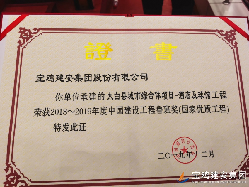 睽違三十載,喜開二度梅。12月10日,從北京會議中心傳來喜訊,由寶雞建安集團承建的太白縣城市綜合體項目—酒店及球館工程,在全國建筑行業精品工程最高獎項大比拼的激烈角逐中,力挫群雄,脫穎而出,最終摘得2018--2019年度中國建設工程魯班獎(國家優質工程)桂冠,這也使寶雞建安集團成為繼法門寺重建工程獲得寶雞第一個建筑魯班獎后,時隔近30年再次奪得“魯班獎”的企業,從而書寫了建筑行業頂級獎“梅開二度”的傳奇!