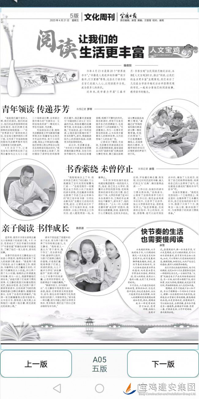編者按:在第28個世界讀書日到來之際,《寶雞日報》社策劃了讀書專版,鑒于寶雞建安集團工會長期堅持舉辦的“書香企業(yè)”征文活動在社會的影響力與美譽度,記者來電提出采訪意向,公司工會極力舉薦了來自基層一線熱愛閱讀并多次參與讀書征文的技術人員張振東同志。5月21日,《寶雞日報》發(fā)表了這篇小專訪,現予轉發(fā)。