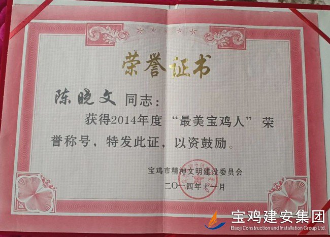 陳曉文同志長期工作在施工一線,勤勤懇懇、兢兢業業,以勤奮努力的工作熱忱和扎實細致的工作作風,贏得了公司上下的一致好評,他所帶領的班組2014、2015、2016年連續被評為優秀班組。其本人也曾于2014年被寶雞市文明委授予“最美寶雞人”榮譽稱號。