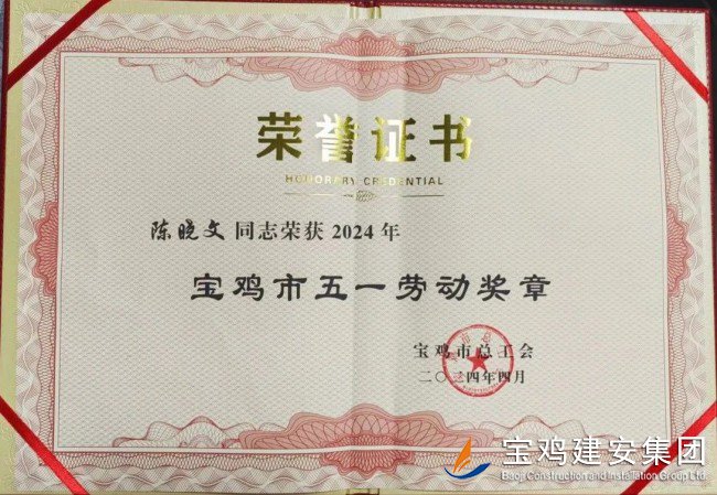 熱烈祝賀我司員工陳曉文斬獲2024年度“寶雞市五一勞動獎章”殊榮